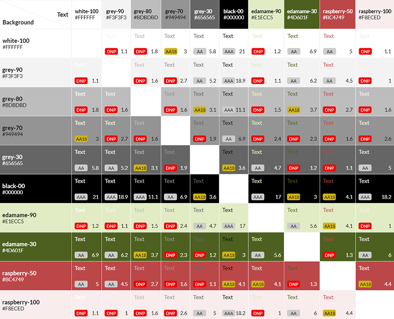Each colour in my chosen palette was tested for WCAG contrast compliance to maintain readability across backgrounds and devices, with a Colour Contrast Matrix created using the EightShapes Contrast Grid tool.