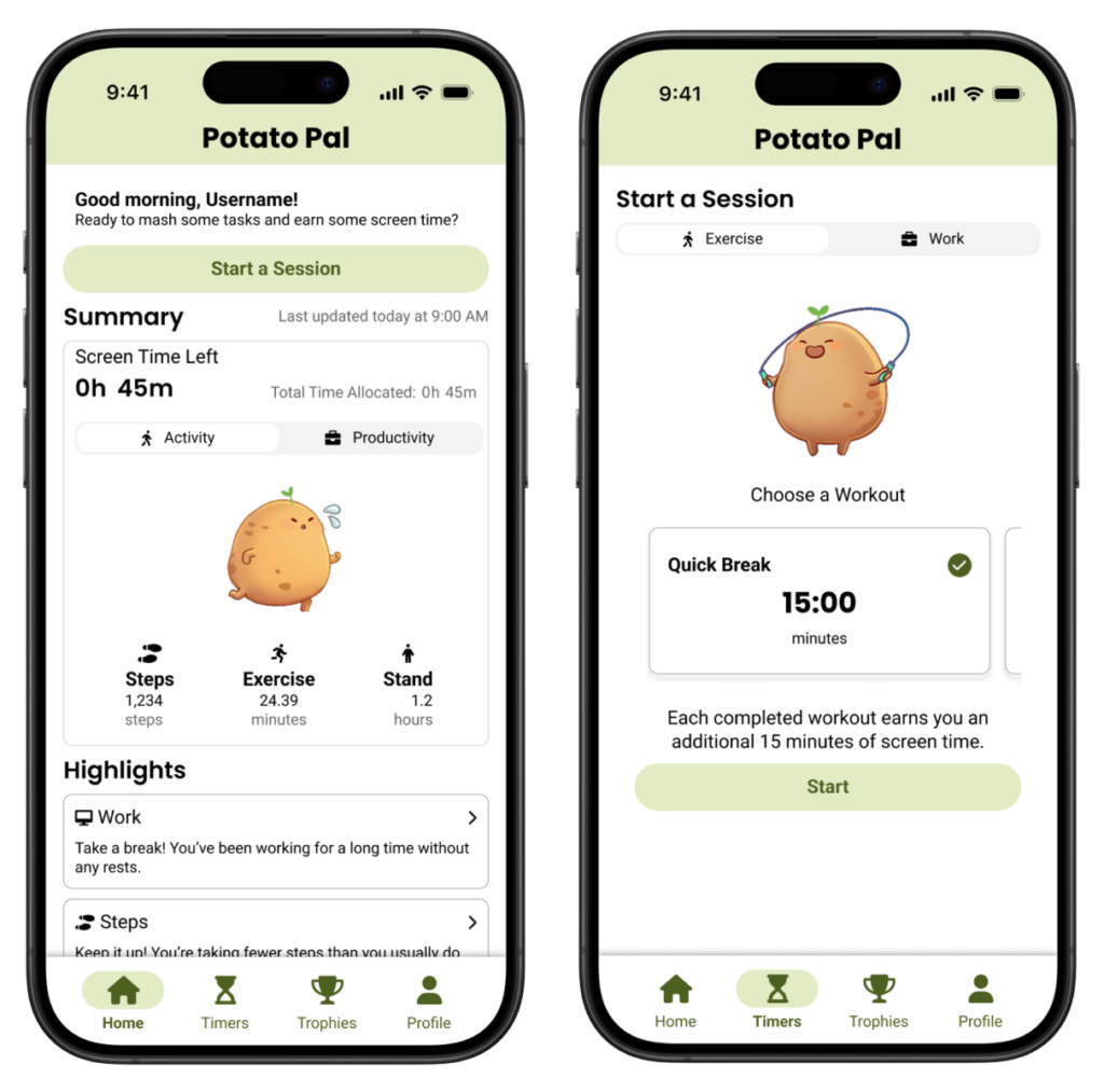 Potato Pal is a mock gamified productivity app that helps users manage screen time and stay accountable. By completing exercise or work sessions, users earn screen time; using their device mid-session voids the reward. If screen time runs out, the app’s mascot, a “Potato Pal”, appears sad until time is replenished, encouraging healthier work-life balance without guilt.