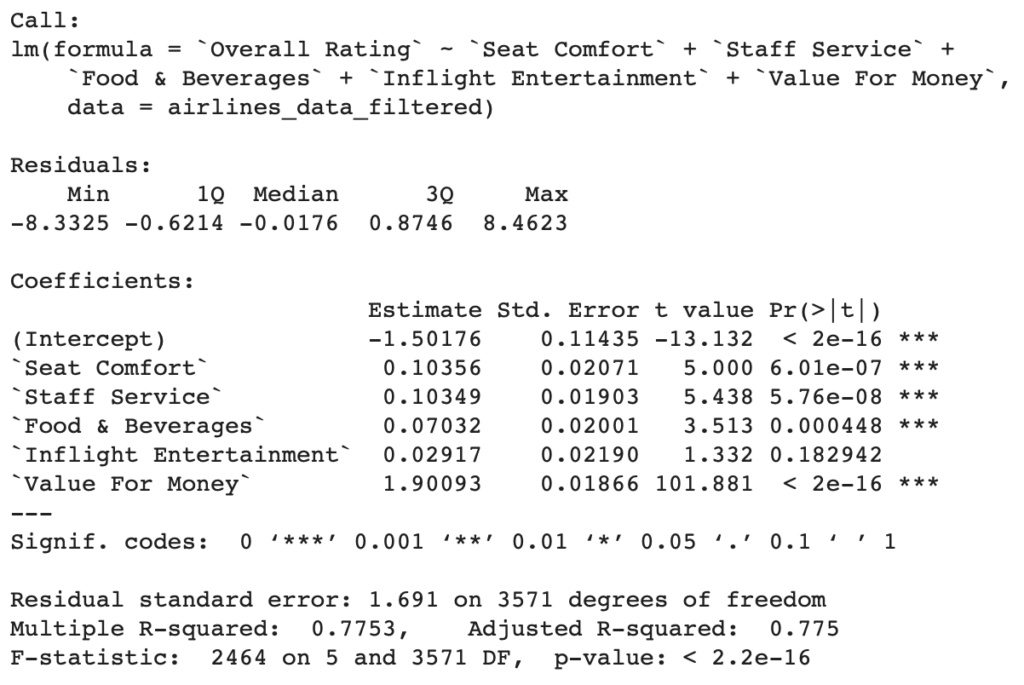 Regression model showed that seat comfort and staff service are significant positive predictors of overall satisfaction, but no single factor fully explains overall rating.